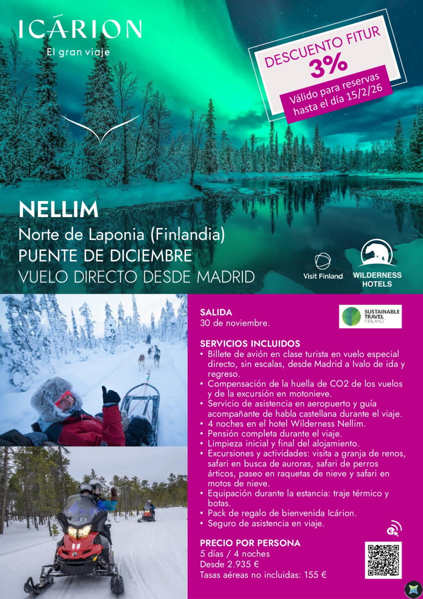 Puente de diciembre en Nellim. Descuento FITUR 3%. Válido hasta el 15/02. Vuelo directo desde Madrid